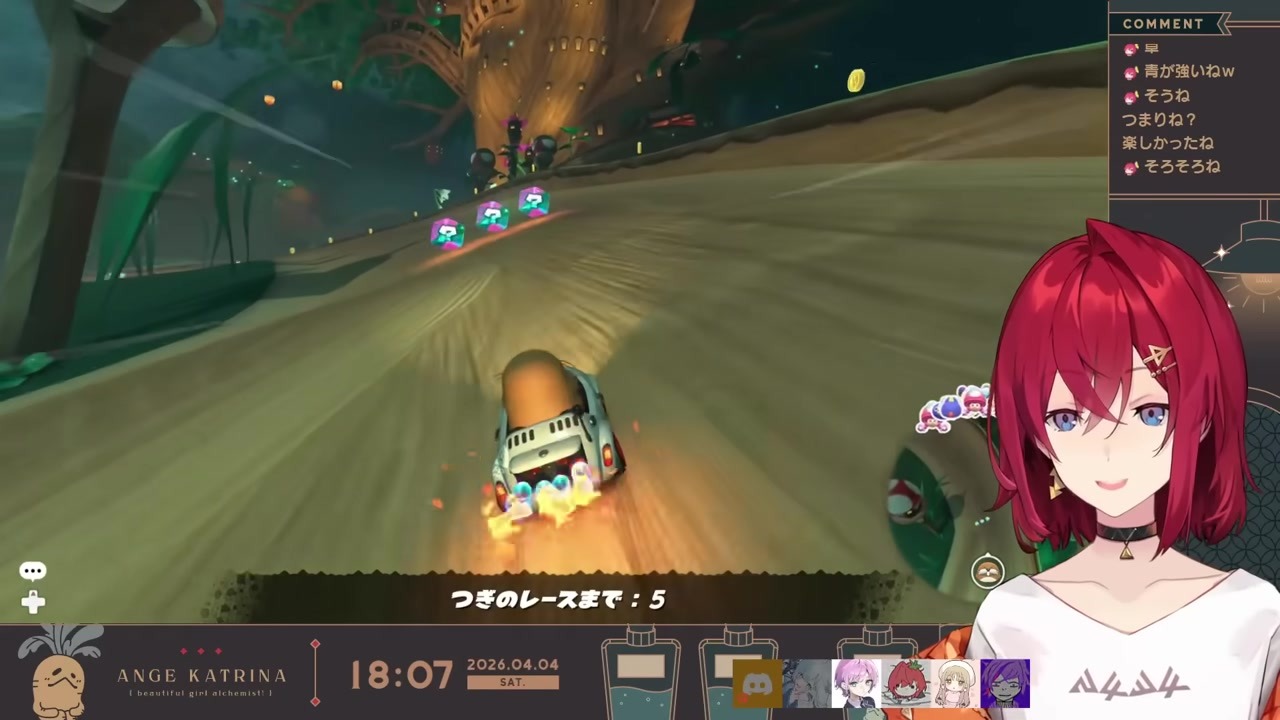 In the Mario Kart Nijisanji Cup loser's bracket, Sepia-iro no Kiseki team rejoices as Peach Beach is selected. After a unity gesture, Ange disables driving assist and goes all-out to secure a 54-point sweep.