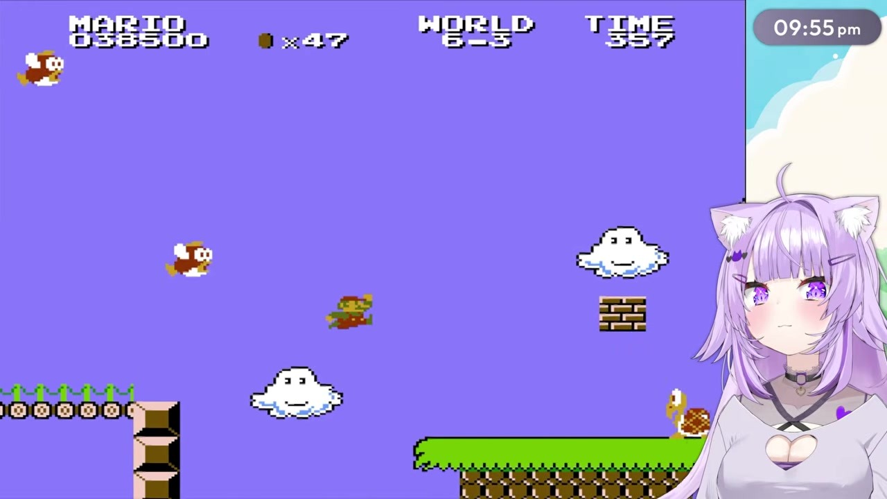 While attempting World 6-4 in Super Mario Bros. 2, the streamer notices a melody clue from the wall patterns and begins taking notes to solve the maze. However, she is overwhelmed by the complex terrain and enemy attacks, falling into a cycle of instant death and screaming.