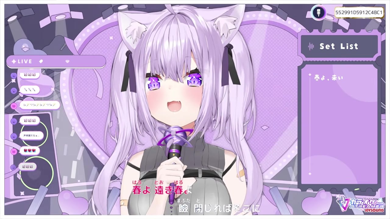 In this clip from the spring singing stream, Nekomata Okayu declares it's her first time performing "Haru yo Koi" (Spring Has Come) on stream. Visibly nervous and repeatedly saying her heart is pounding, she delivers the highly anticipated debut performance.