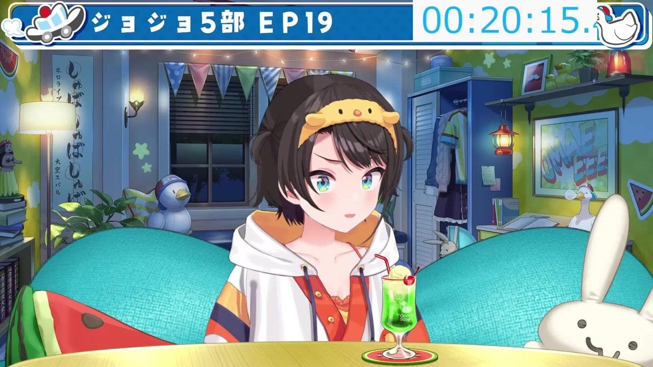 During a JoJo's Bizarre Adventure: Golden Wind watchalong, as Giorno heals the near-fatal injury of Mista by replacing his organs but the pain remains, Subaru excitedly screams "So gross!" and rates it "Kind of mediocre as a healer," while admiring Mista's resolve and Giorno's invincibility.