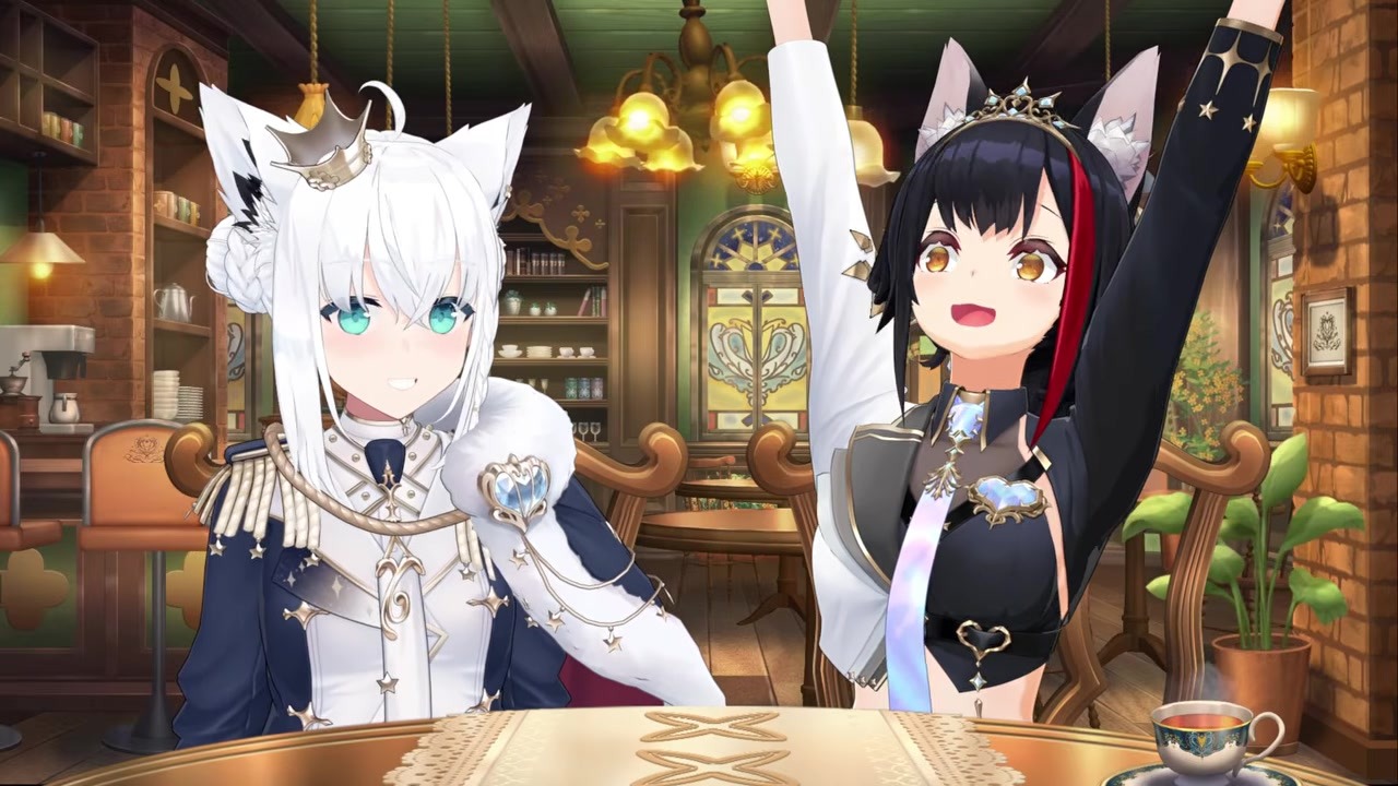 Fubuki's original mascot characters 'Royal Hox' and 'Royal Wolf' plushies, refined with Mio and illustrated by Itosou-sensei, are announced. The acrylic stands feature connectable diamond-shaped bases that form a star when displayed together. The legendary 'Tete-Mushi' (caterpillar on Mio's tail) also gets an official keychain. Viewers praised Fubuki's design skills with comments like 'As expected of Fubuki!' and prepared their wallets.
