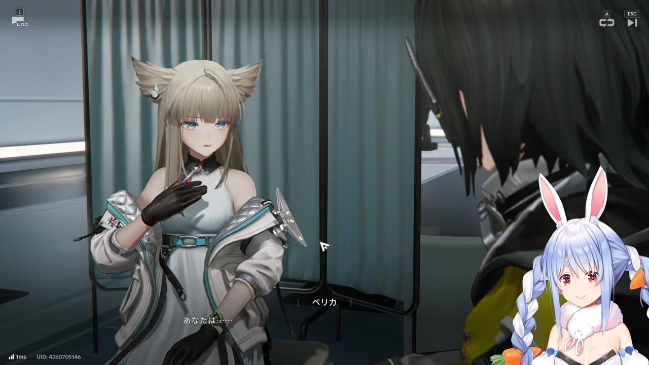 Gameplay of "Arknights: Endfield". Character Pelika offers the protagonist (Pekora) a whole apple, prompting Pekora to complain that she wanted a bunny-shaped apple instead.