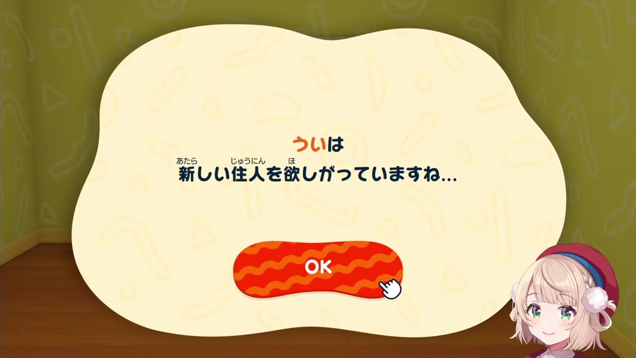 About 30 minutes into the stream, Shigure Ui decides to create Oozora Subaru as a new Mii in Tomodachi Collection. After getting Subaru's permission and sending a reference image, Ui reveals that Subaru praised her work and had even tried to "summon Ui onto her right hand" while creating characters on her own island. Bracing themselves for the "hell of character creation" and a "2-hour course," she begins crafting Subaru's Mii with the audience.