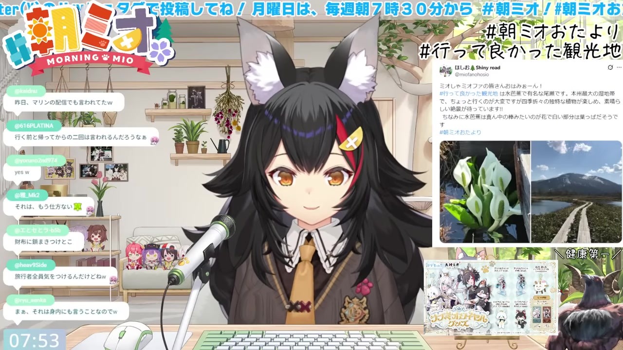 A clip from the morning chat stream "Asa Mio". After reading a super chat about the Oze wetlands and mizubasho, Ookami Mio suddenly starts singing "Haruka na Oze" a cappella. She worries it might be a Gunma local song, but is relieved when viewers reassure her it's known nationwide.