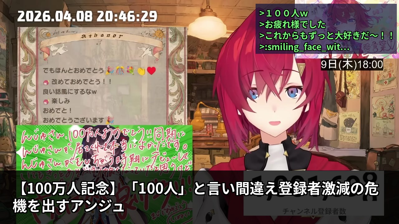 登録者100万人突破を迎えたアンジュ・カトリーナが、4月8日を「アンジュ・カトリーナ100万人記念日 アットアンド罪懺悔(許された)記念日」として定着させようと宣言。30分前の突然の告知にも関わらず駆けつけてくれたファンへの愛を語り、明日18時公開の歌みた「合言葉」を告知した。