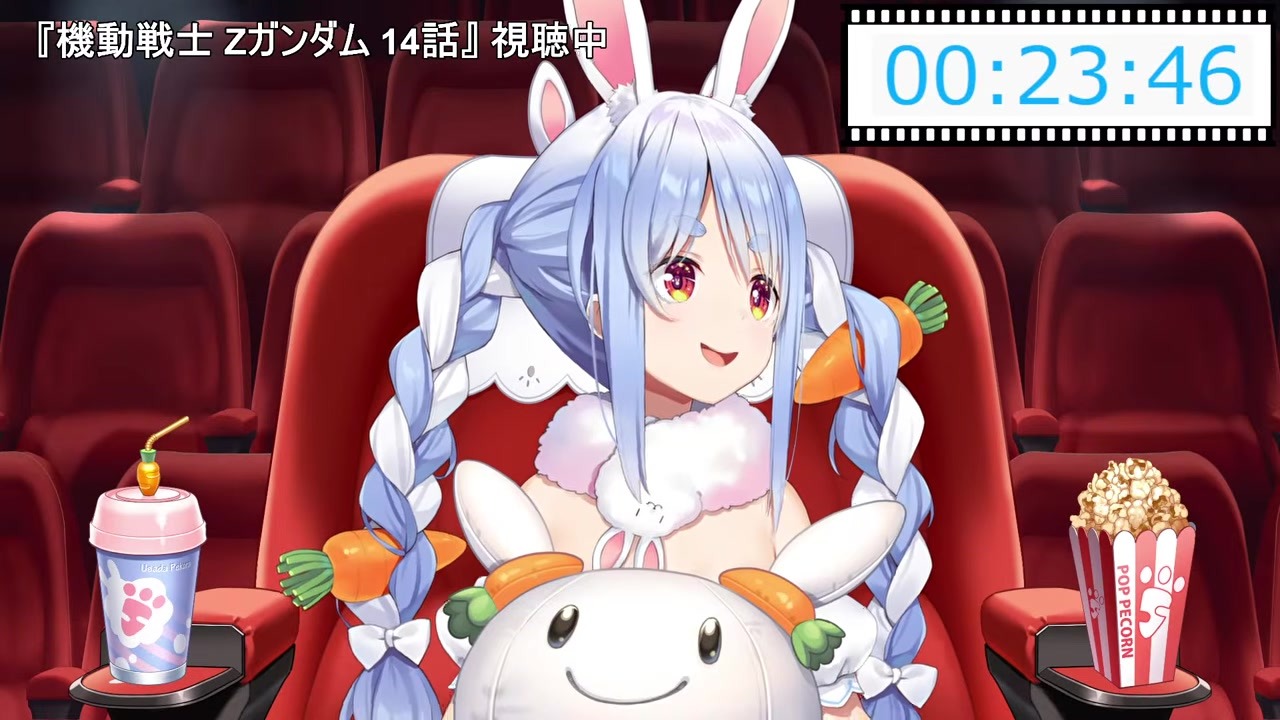 『機動戦士Zガンダム』第14話の同時視聴。アムロ・レイが輸送機で敵陣に突撃し、パラシュートで生還するシーンに兎田ぺこらが大興奮。「輸送機でぇ!?」「生きるのかよー!」「アムロ天才すぎだろ!」と絶叫し、カミーユとの初対面にも注目。次回が気になりすぎて予告を見ずに15話へ向かう。