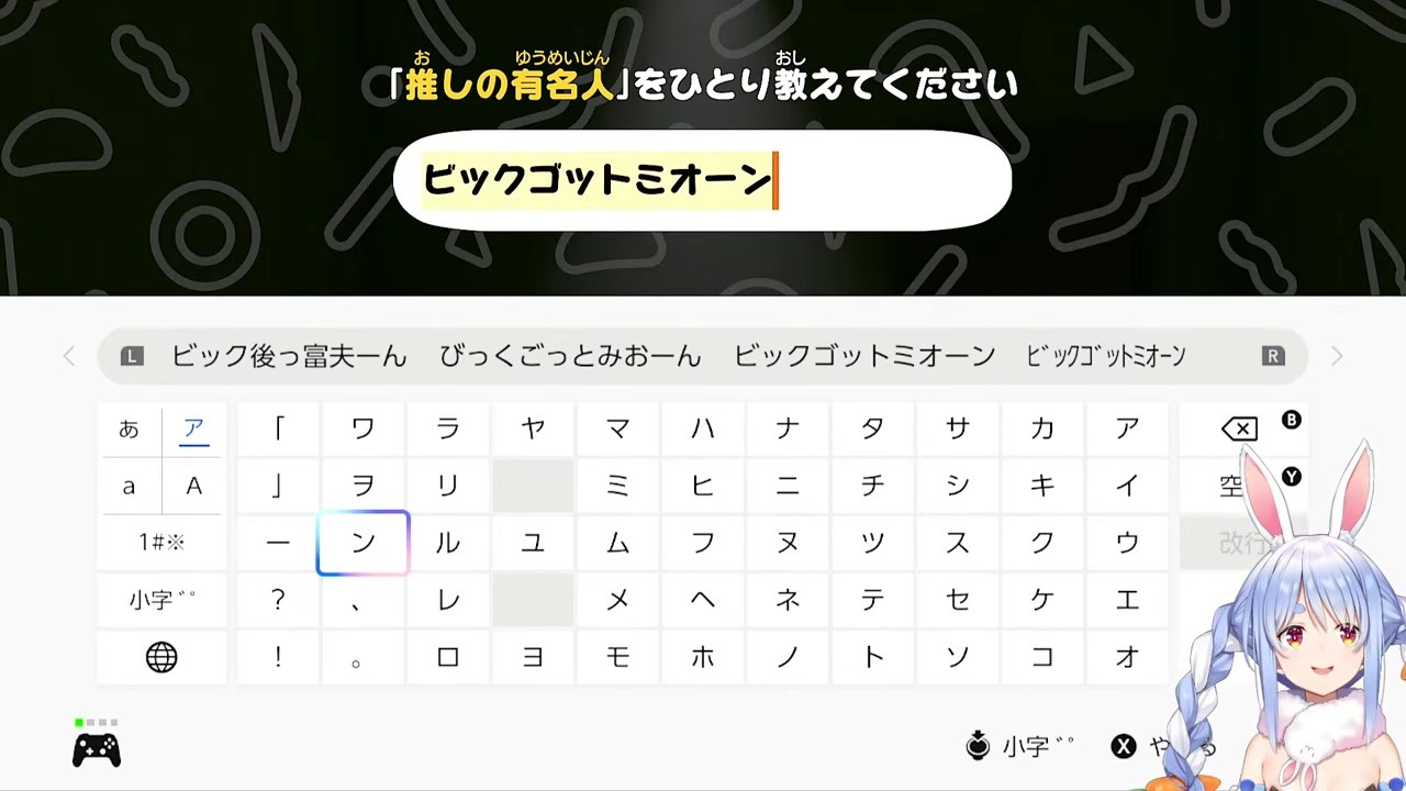 『トモダチコレクション』で住民の「推しの有名人」を設定する場面。兎田ぺこらは大神ミオ(ビッグゴッドミオン先生)を登録しようとするが、カタカナ入力で『ビッグ』を『ピッグ』と間違えてしまう。視聴者から『ビッグでは?』と指摘されると『いちいちシャーシャーシャーシャー』と逆ギレしつつも、最終的に訂正する。