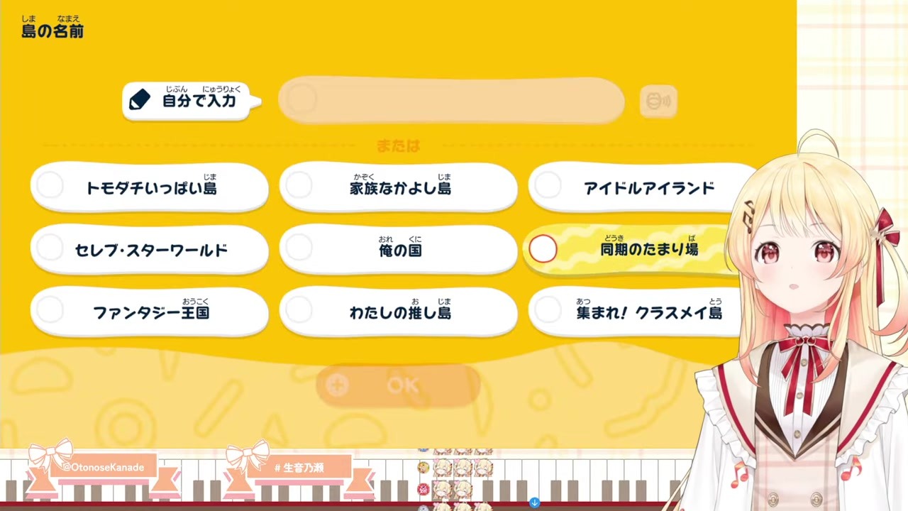 トモダチコレクション初見プレイ。視聴者からの「お前らの島」「月曜島」などの提案に対し「おっさんの島になっちゃうじゃん」と鋭くツッコミを入れつつ、自身の名前にちなんだ「ドレミファソラシドウ」という秀逸な島名を決定する音乃瀬奏。