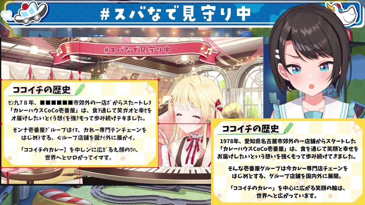 ココイチに関する配信の切り抜き。台本を読み進める中、画面外からの声によるツッコミと指導が飛び交い、カレーの組み合わせがなんと12億通りもあることが判明する。