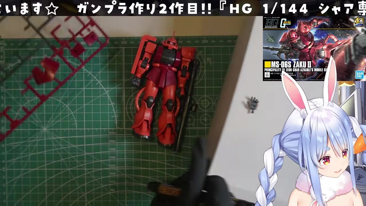 ガンプラ配信で初めて墨入れに挑戦した兎田ぺこら。視聴者と共に動力パイプを“小腸”と呼称し、その“小腸”に初めて墨を入れるも緊張で手が震え、「それはチリしてるか!?」と叫びながら試行錯誤する